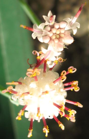 Scientific Name: Ledebouria socialis Non so se sia davvero una pianta grassa, ma è considerata tale da molti. Più che altro mi pare un bulbo. Produce lunghi steli fiorali con decine di piccoli fiori verdini, con stami viola, non particolarmente attraenti. |
